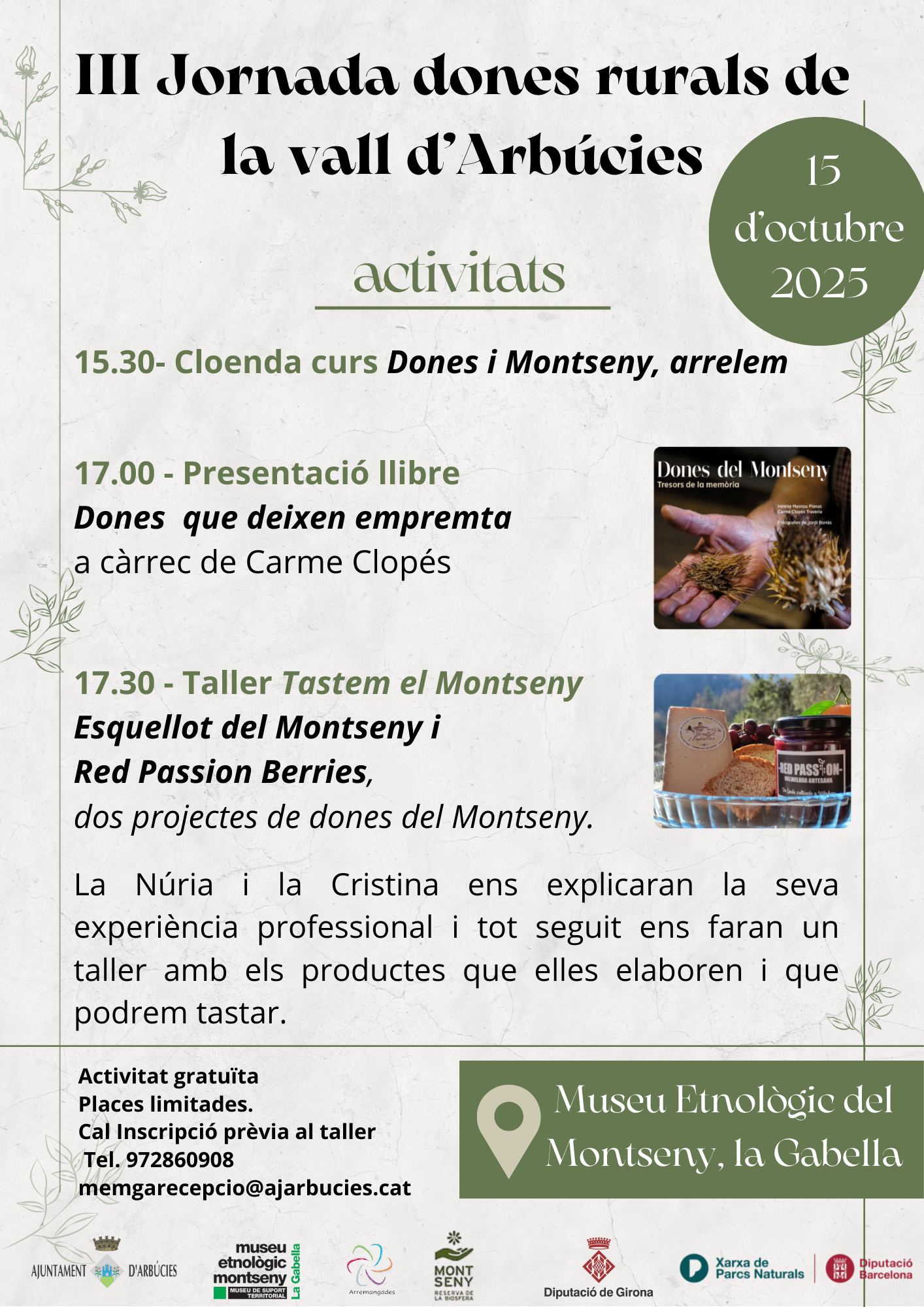- 17.30 - Taller Tastem el Montseny: Esquellot del Montseny iRed Passion Berries, dos projectes de dones del Montseny. La Núria i la Cristina ens explicaran la seva experiència professional i tot seguit ens faran un taller amb els productes que elles elaboren i que podrem tastar.