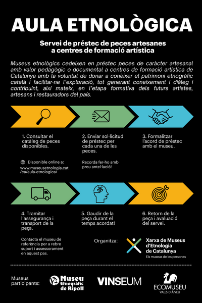 La Xarxa de Museus d'Etnologia de Catalunya posa a disposició dels centres de formació artística un servei innovador: el préstec temporal de peces de les seves col·leccions. Es tracta d'objectes amb valor artesanal, pedagògic i documental, seleccionats per la seva idoneïtat i bon estat de conservació.